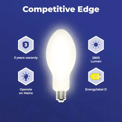 Cette ampoule LED HID Elliptique E27 18W 2800lm - 830 Blanc Chaud | Remplacement 50W est le remplacement idéal des lampes à décharges classiques. Grâce à sa faible consommation d'énergie, vous pourrez économiser beaucoup d'énergie. Cette lampe Budgetlight ne consomme en effet que 18W en remplaçant les anciennes lampes de 50 W. Cette lampe a une classe énergétique élevée D ce qui signifie que vous pourrez faire des économies d'énergie susbtantielles. Avec sa durée de vie moyenne étendue, environ 25000 heures, vous n'aurez pas à la changer avant plusieurs années.