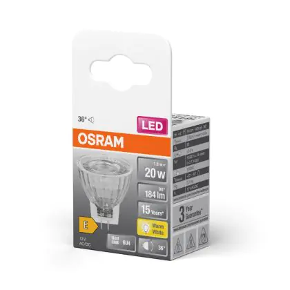Les ampoules GU4 LED constituent la solution de remplacement idéal pour tous les spots GU4 traditionnels, à incandescence ou halogène. Ce spot Osram LED Star Classic Réflecteur Spot GU4 MR11 2.5W 184lm 36D - 827 | Remplacement 20W est la variante à LED de l’ampoule GU4 classique. Cette ampoule Osram présente l’avantage d’avoir la technologie LED intégrée et de pouvoir diffuser la lumière de façon uniforme. Cette ampoule a une durée de vie largement supérieure aux spots classiques, en effet, vous pouvez espérer conserver ce spot environ 15000 heures. Ce spot Osram n’utilise que 2.5 W et remplace les solutions classiques de 20 W. Ce spot LED est produit par Osram, vous êtes donc assuré de sa qualité.